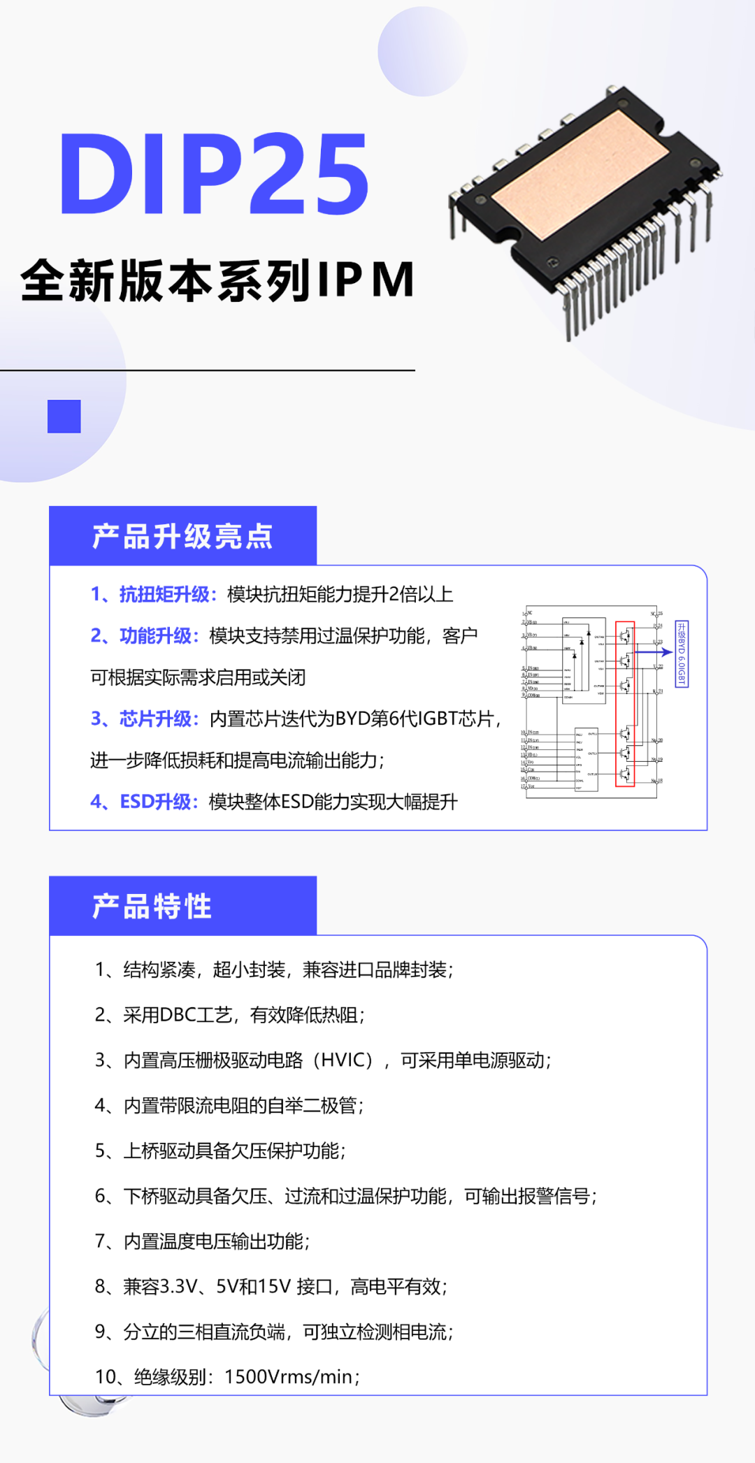 秉承“用技术创新满足人们对美好生活的向往”的技术理念,比亚迪半导体立足核心技术,坚持自主研发,精耕产品设计,历经时间的打磨,成功推出DIP25系列IPM的全新升级版本,在延续第一代功能的基础上,大幅提升了产品性能,以强劲实力应对市场的全新挑战。