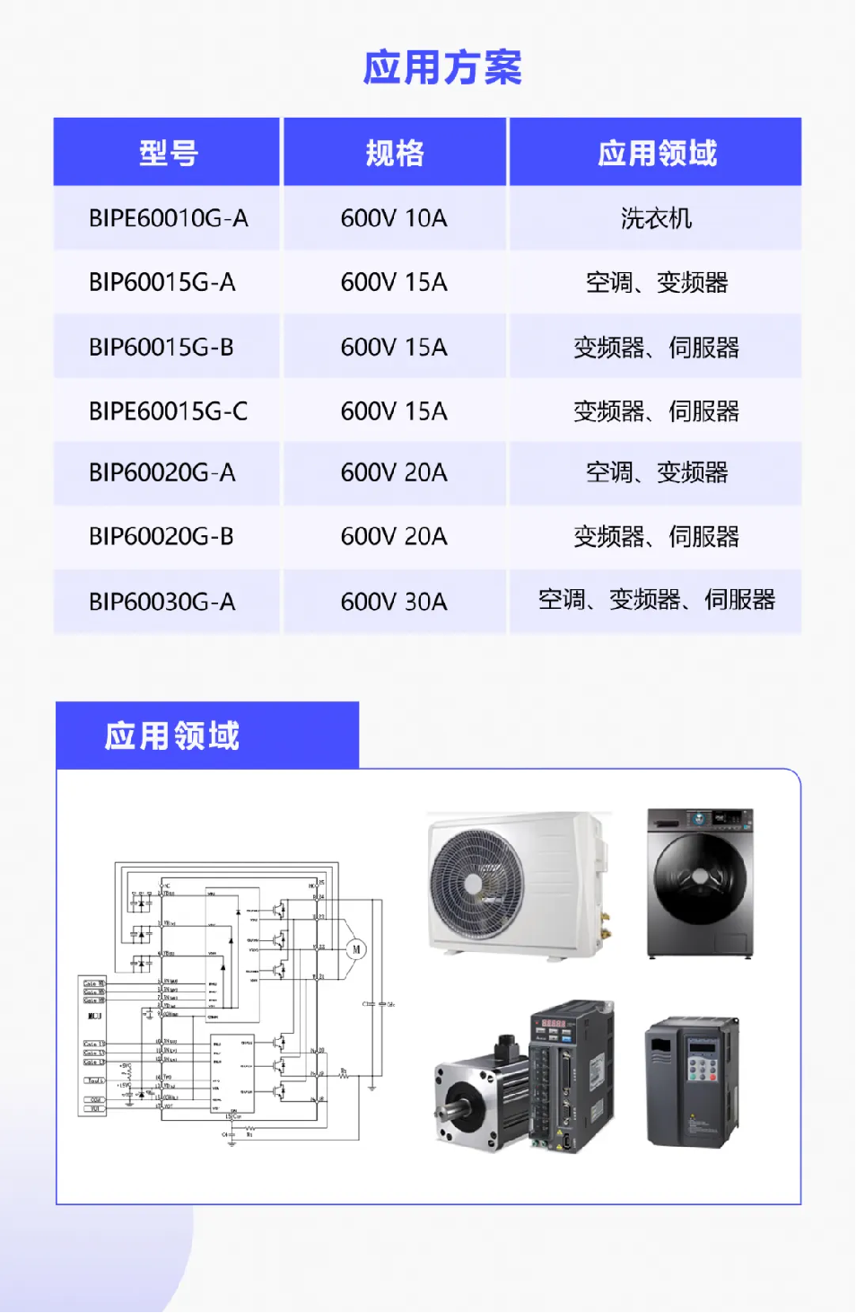 该产品适用于结构紧凑、性能高效的电机驱动器,如小功率变频器和变频家电等领域,它的超小封装和优秀性能使其成为该应用领域的理想选择,已广泛应用在白色家电和变频伺服领域,累计出货量行业领先。