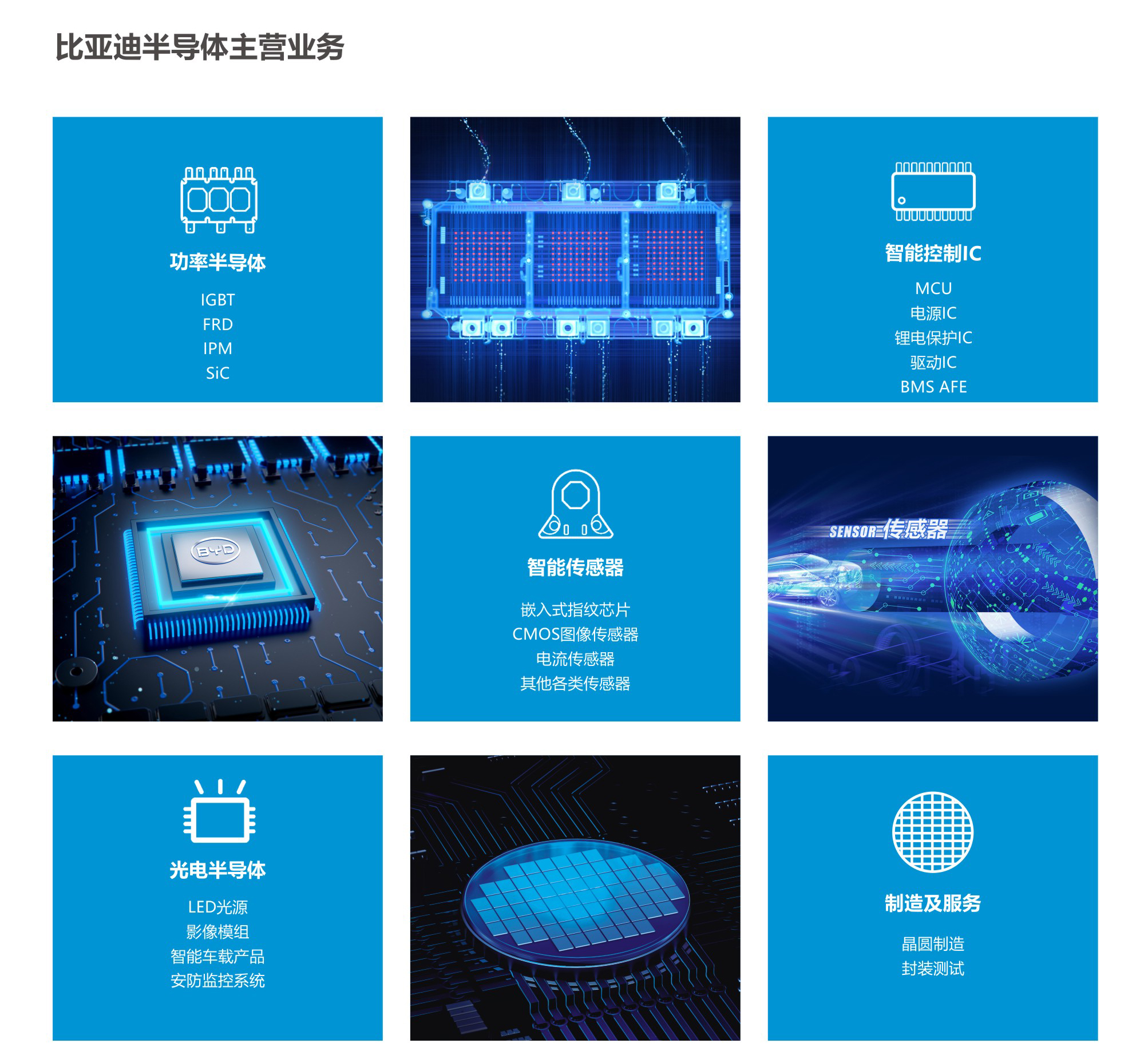 比亚迪半导体以全方位的前瞻布局,产品广泛应用于汽车、能源、工业、通讯和消费电子等领域,具有广阔的市场前景。公司在快速发展、市场份额持续提升的同时,始终以高品质服务于国内外客户,立志成为高效、智能、集成的新型半导体供应商,为广大客户提供领先的车规级半导体整体解决方案,共同推动产业向更高质量、更宽领域的未来迈进。