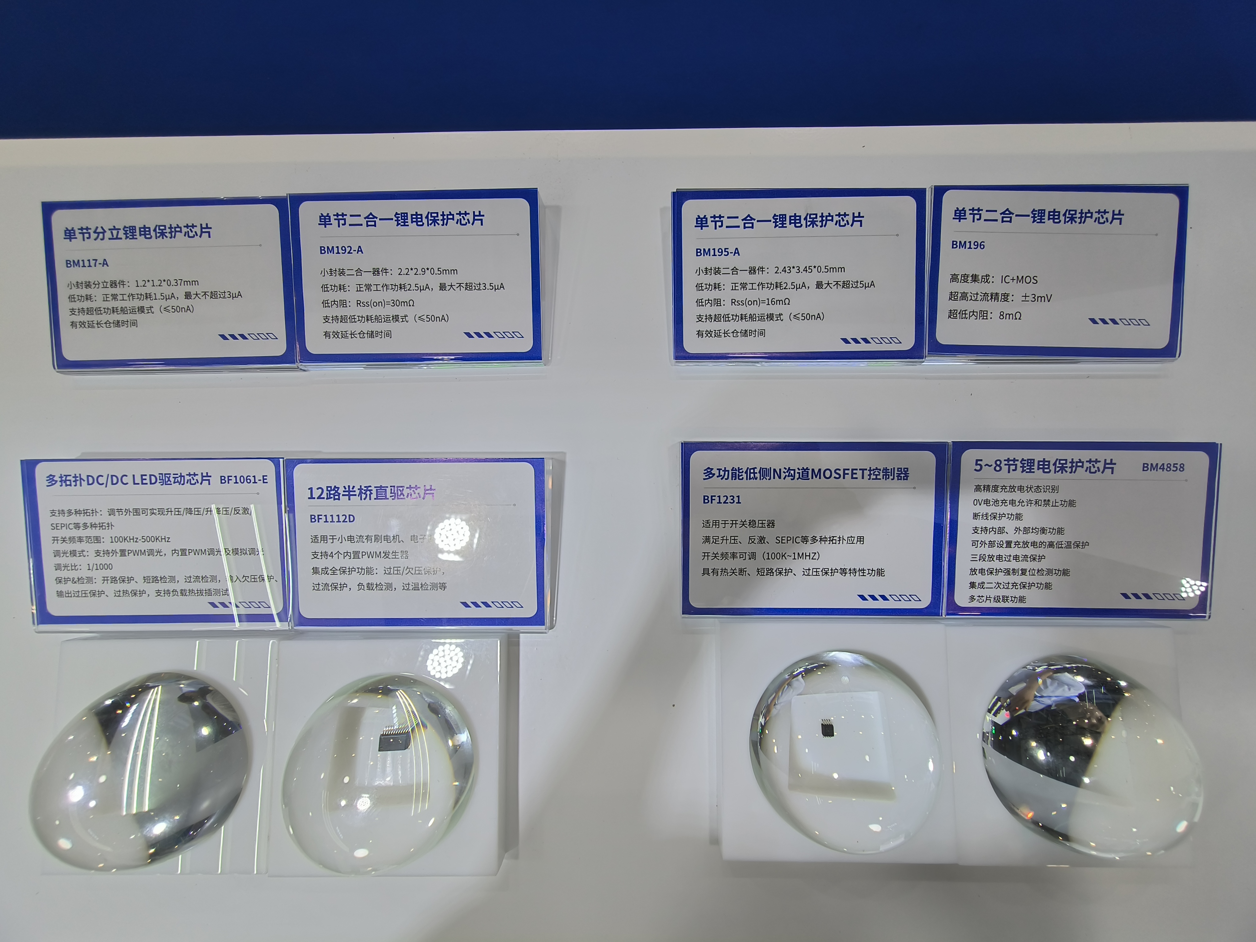 现场还展示了保护IC、驱动IC、DC/DC IC、AC/DC IC、运放IC等系列电源管理芯片。电池保护IC有高精度、高集成度和低功耗等特点,具备完善的保护功能,还拥有电芯容量平衡功能,可减小各节电芯的容量差异,延长电池组寿命。隔离驱动IC可满足1200V驱动需求,内部集成欠压保护与输入互锁等多种保护功能,可广泛应用于光伏与储能、新能源汽车、家用电器等产品。升压反激DC-DC IC具有高输入耐压、频率外置可调等特点,内置软关断、电路保护、过压保护等功能,适用于升压、反激与SEPIC等拓扑。AC-DC控制IC系列产品满足恒压与恒流模式下工作的不同需求,内置多种功能,不仅满足能效VI,而且能简化EMI设计,适用于光伏与储能、家用电器等产品。运放IC是轨到轨输入输出运算放大器,具有低压失调电压与稳定的高频响应,可用于面积受限的汽车和便携式电子设备。